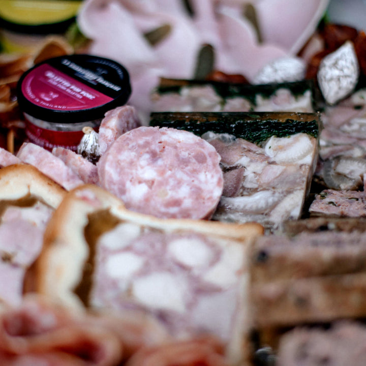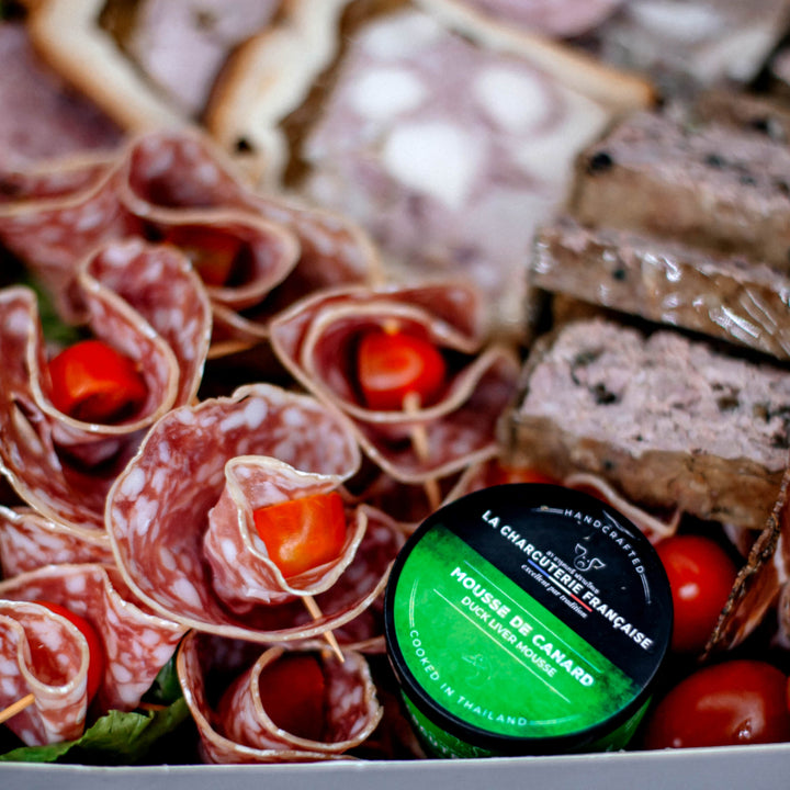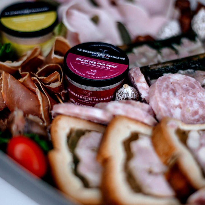 Born from a way of life, the charcuterie board embodies French conviviality. Inspired by village apéritifs and generous southern tables, it brings together honest, noble products prepared with care. In our Hua Hin workshop, every board is hand-assembled from artisanal charcuterie made to traditional French recipes. Nothing is left to chance: the cut, the balance of flavors, the freshness. Each board becomes a ready-to-share gourmet scene.
